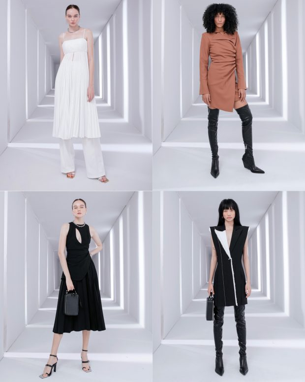 BST đầu tiên mang tinh thần tối giản với các gam màu trung tính như đen, trắng, xám, nâu. Điểm nhấn nổi bật của bộ sưu tập là set váy hồng phối cùng sơ mi tay bồng dập ly, đây là phong cách được dự đoán sẽ là xu hướng thời trang trong năm 2021.
