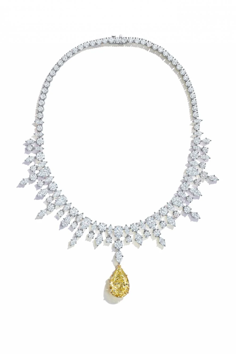 Được chế tác từ bạch kim và vàng vàng 18 carat, chiếc vòng cổ có hơn 70 carat kim cương trắng cắt hình quả lê, hạt ngọc và tròn. Quan trọng nhất, nó được neo bởi một viên kim cương màu vàng Fancy Intense 21 carat ở chính giữa. Viên đá tuyệt đẹp được khai thác có đạo đức từ Botswana, trước khi được cắt và đánh bóng ở Antwerp.