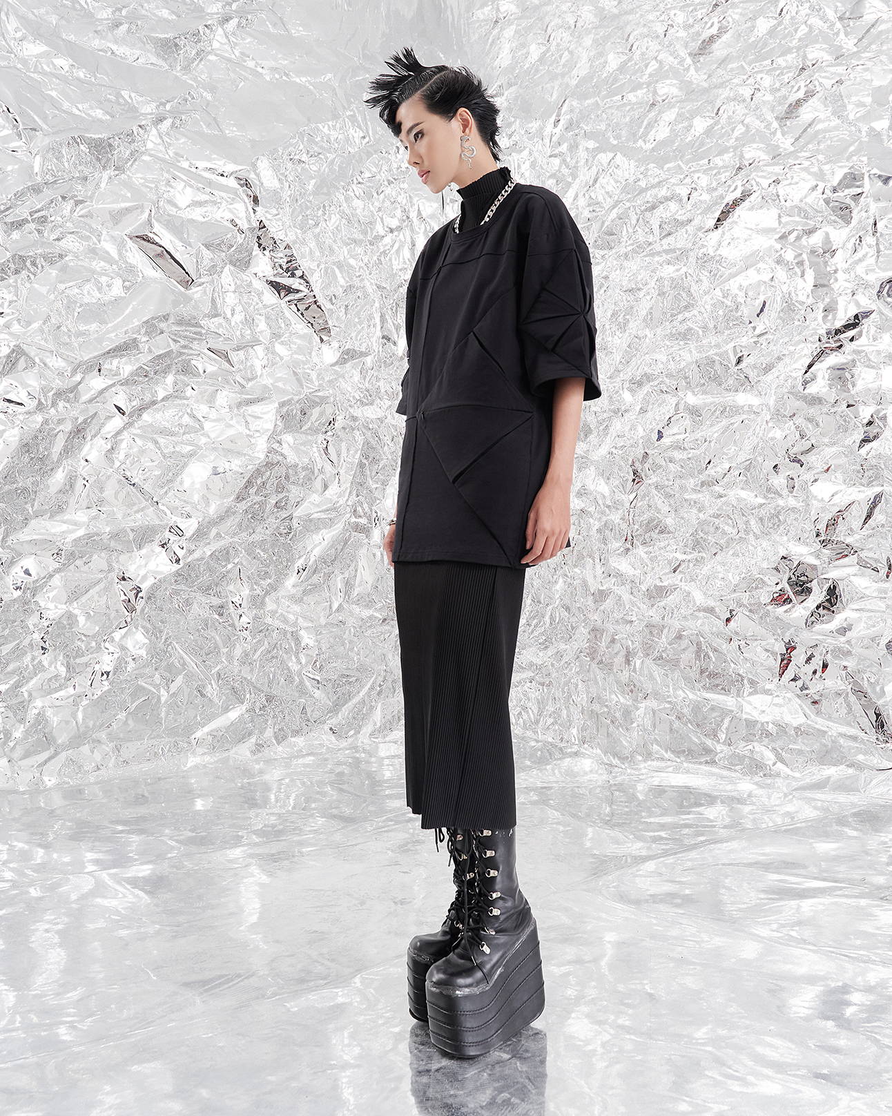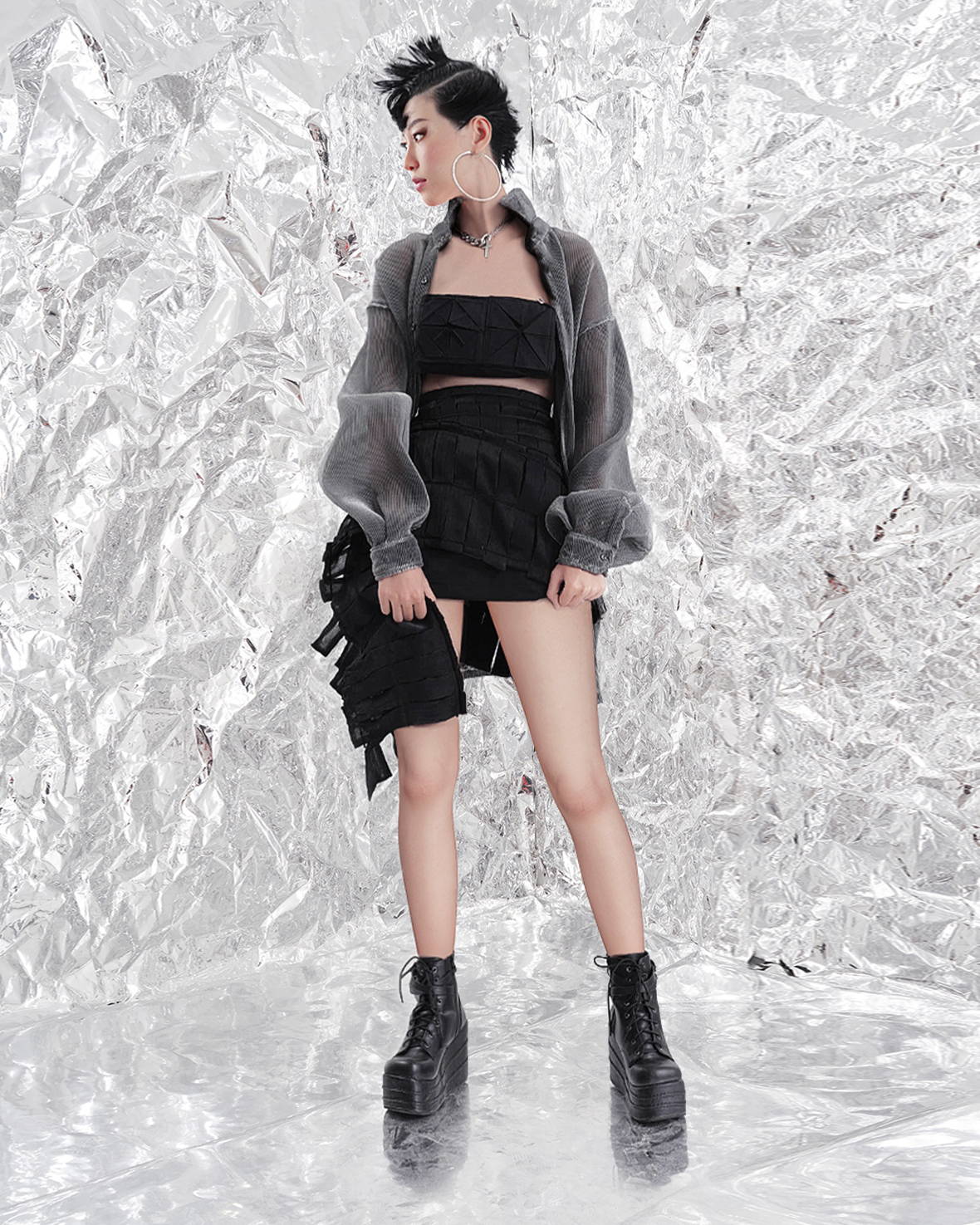 Đồng thời, tính chất đa năng của trang phục cũng được nhà thiết kế tận dụng triệt để khi mang đến những chiếc quần áo có kiểu dáng điều chỉnh tuỳ ý, tạo cảm hứng cho người mặc.