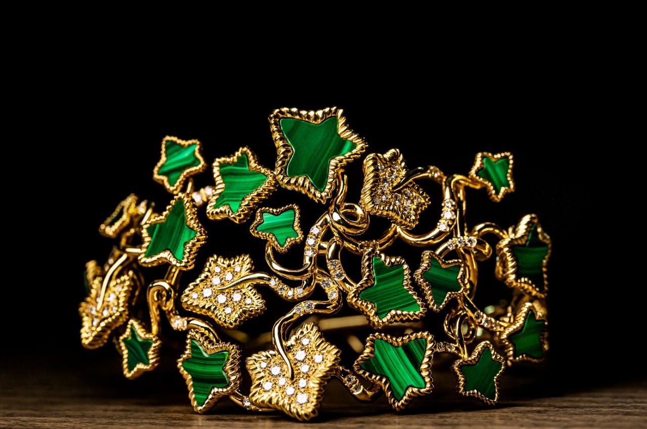 Tinh thần tự do và ngẫu hứng toát lên trong tất cả các thiết kế của bộ sưu tập Leaves of Love. Đá malachite là vật liệu được sử dụng phổ biến tạo nên các sắc thái khác nhau của màu xanh lá cây, nổi bật trong những đường viền bằng vàng và xen kẽ với những viên kim cương quý. Tất cả rải đều và hòa vào nhau nhẹ nhàng như sương mai, gợi lại vẻ đẹp từ những khu vườn kỳ diệu trong ký ức của Quý ngài Dior.