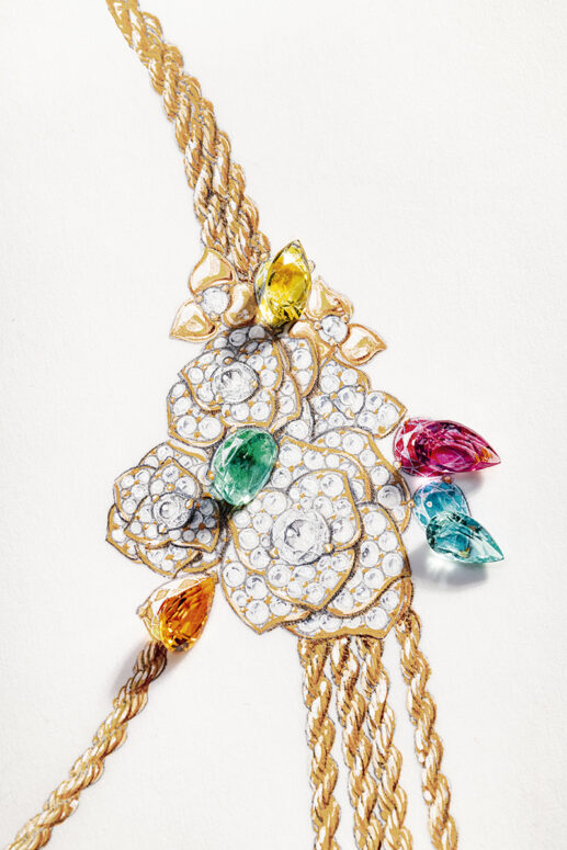 Tựa như sự rực rỡ của pháo hoa trên nền trời, bộ trang sức từ vàng hồng – bao gồm đôi bông tai ear cuff đầy sáng tạo, chiếc nhẫn và vòng cổ độc đáo – tương phản với hai bộ trang sức còn lại, lấy cảm hứng từ những sắc màu mềm mại trong khu vườn đa dạng của Yves Piaget.