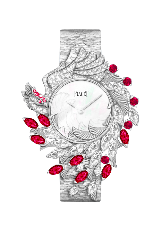 Hai chiếc đồng hồ Phoenix High Jewellery khoe nét nữ tính và quý giá. Một chùm kim cương lộng lẫy và những viên kim cương cắt đối xứng tô điểm cho chiếc đồng hồ 32mm theo họa tiết bất đối xứng, khi các chi tiết chạm khắc bằng vàng dâng trào trên mặt số, làm nổi bật thiết kế tinh xảo. Kết hợp cùng một chiếc vòng tay bằng vàng được hoàn thiện kiểu Decor Palace, một trong những kỹ thuật khắc vàng nổi tiếng nhất của Piaget. Mẫu thứ hai kết hợp giữa hồng ngọc và vàng trắng, mỗi mẫu được sản xuất giới hạn 8 chiếc.