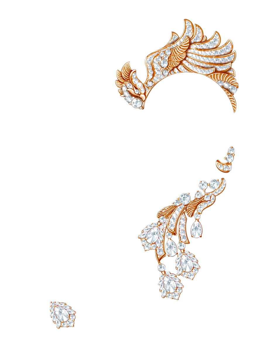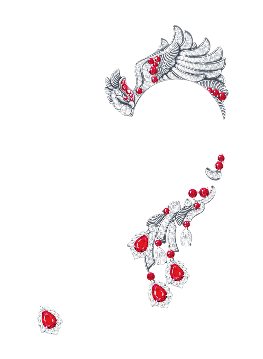 Lần đầu tiên, bộ sưu tập rút gọn ra mắt các sáng tạo trang sức cao cấp: một chiếc trâm cài và chiếc nhẫn Rồng độc đáo, cùng hai chiếc khuyên tai Phượng hoàng.