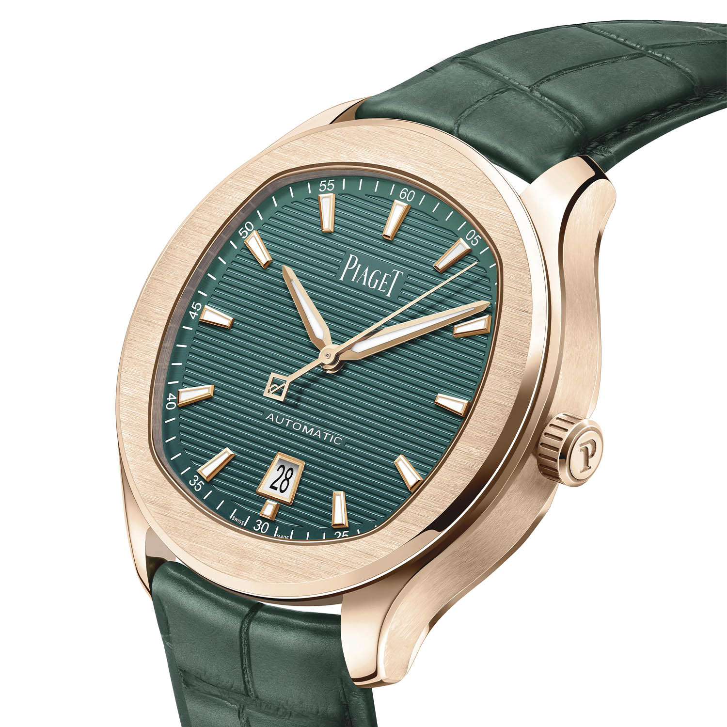 Sau hai phiên bản Polo Date bằng thép đi kèm mặt số màu xanh lá cây được ra mắt giới hạn, Piaget tiếp tục trình làng phiên bản giới hạn thứ ba vẫn với sắc xanh chủ đạo, nhưng điểm khác biệt nằm ở chất liệu chế tạo, khi được trang bị bộ vỏ vàng hồng 18k có kích cỡ 42mm x 9.4mm giữ nguyên về thiết kế, cùng khả năng chống nước ở độ sâu 100m. Phong cách mặt số nổi bật bởi kết cấu rãnh ngang, ánh kim loại và sắc xanh lục đậm vẫn hiện hữu trên sáng tạo mới tương tự các phiên bản giới hạn bằng thép trước đây.