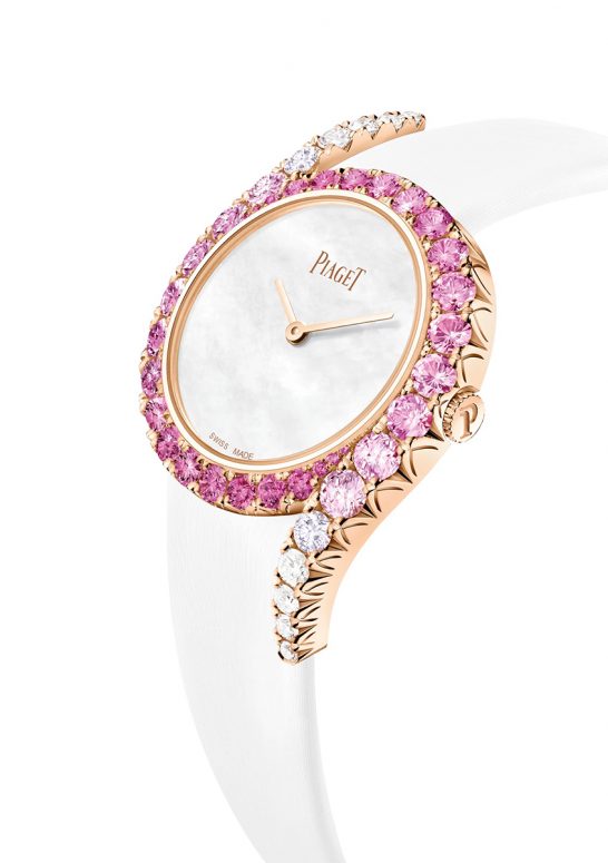Riêng Precious Sunset lại tỏa sáng với sắc màu ấm áp của đá sapphire hồng, kim cương cùng vàng hồng 18K. Thiết kế bất đối xứng và phần dây đeo satin trắng của đồng hồ sẽ ôm trọn cổ tay ngọc ngà của các quý cô như một dải lụa mềm.