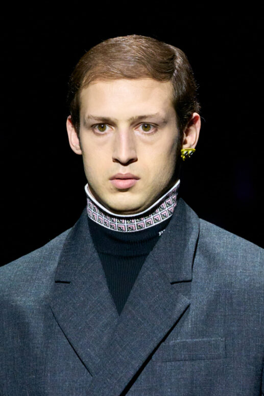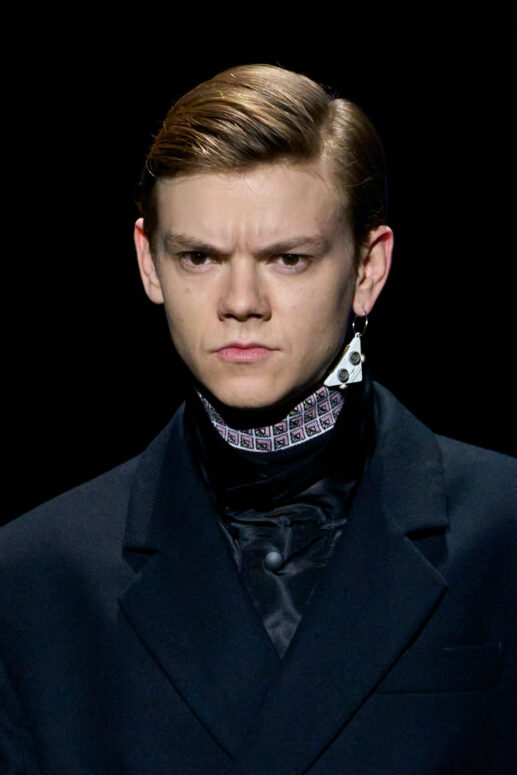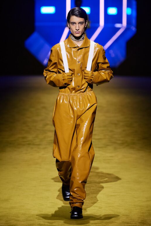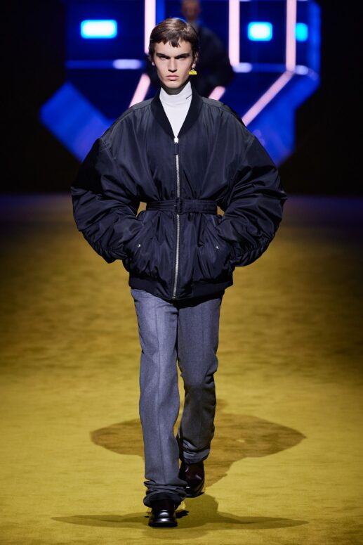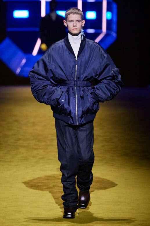 Sự lựa chọn này làm nhiều người không khỏi liên tưởng đến show diễn Thu Đông 2012 của Prada, khi bộ sưu tập năm ấy cũng có sự tham gia của nhiều tên tuổi đình đám của làng điện ảnh như Gary Oldman, Adrien Brody, Willem Dafoe, và Jamie Bell. Như thể cánh cổng không gian ánh xanh đằng sau – lối ra của dàn người mẫu – đã đưa những màu sắc điện ảnh năm xưa đến với show diễn Thu Đông 2022.