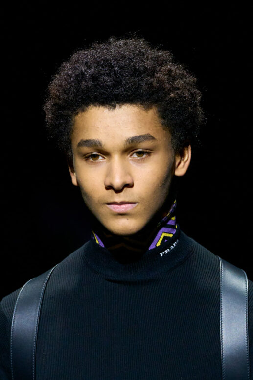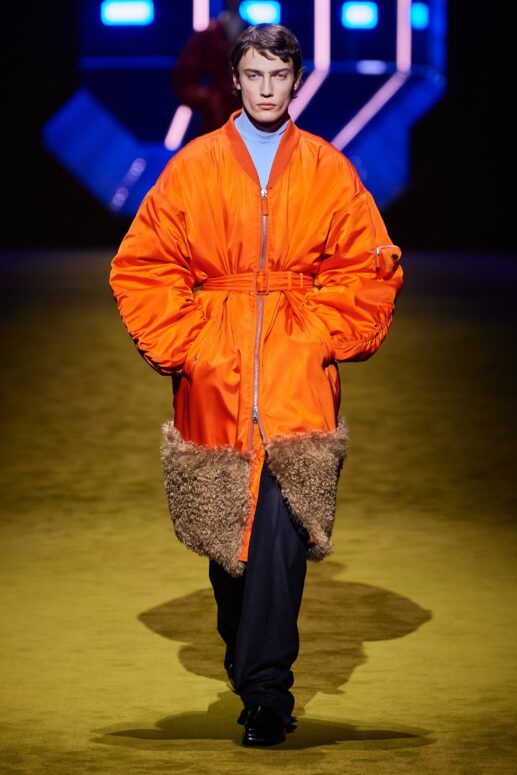 Không dừng lại ở đó, Raf Simons và Miuccia Prada vẫn kịp để lại dấu ấn lịch lãm qua những lớp lông mohair, tô điểm trên các phom áo khoác dài, hay chiếc áo khoác MA1 màu cam sặc sỡ. Những lớp lông này là điểm nhấn quan trọng đem lại sự mềm mại cho hình ảnh nam giới Prada.