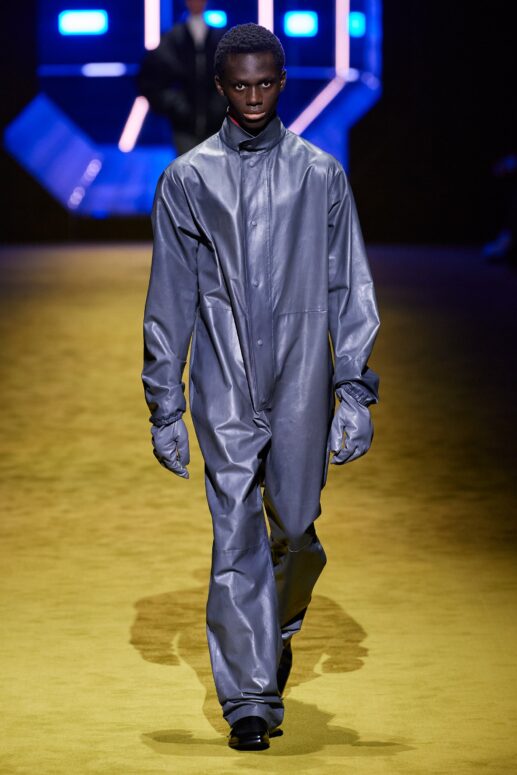 Nếu một số thiết kế áo khoác dài được tái cấu trúc rõ rệt với chi tiết cầu vai ngoại cỡ (dù thiết kế này lại khá giống với Balenciaga…), thì bộ áo liền quần không còn làm từ chất liệu len bông mềm mại như ở bộ sưu tập trước. Thay vào đó là chất liệu da bóng hoặc lụa, phom dáng cũng không ôm sát mà được nới rộng để tạo cảm giác linh hoạt, thoải mái – một trong những đặc tính cần thiết của thời trang lao động.