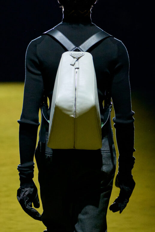 Khi các thiết kế vốn đã hướng nhiều đến hình ảnh lịch lãm, kín đáo của một quý ông truyền thống ngày đông – luôn phủ vải kín cổ bằng 2-3 lớp áo đầy ấm cúng và trang trọng, cùng cặp kính đen vuông vức, tay đeo những chiếc túi da to trơn nhẵn, hay tiện hơn là ba lô ngay sau lưng. Ở bộ sưu tập lần này, phụ kiện của Prada cũng khá đơn giản với một vài thiết kế bông tay, khuyên tai theo hình hài hay khuôn mặt của một con robot.