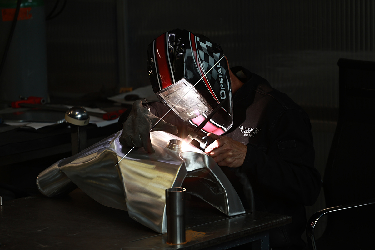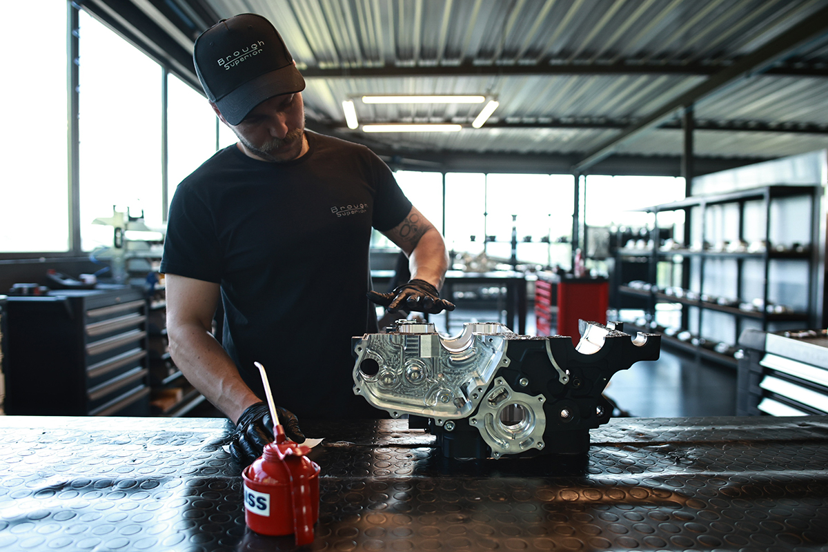 RMB01 vận hành bởi động cơ hai xi-lanh, dung tích 997cc điêu khắc từ khối nhôm nguyên khối series 5000 giàu magie. Qua gia công chính xác, mỗi chi tiết được tối ưu và khoét rỗng, chỉ còn lại 23 kg từ 160 kg nguyên liệu. Thay vì chạy đua công suất tối đa, đội ngũ Brough Superior tập trung mở rộng dải sử dụng, giúp mang lại công suất 130 mã lực có thể khai thác triệt để trên đường đua, kèm các khe khí động học đảm bảo lực ép và ổn định. Khung carbon chịu lực như “bộ xương ngoài” ôm lấy cụm cơ khí, toát lên kiến trúc cơ bắp, mạnh mẽ qua từng đường nét.