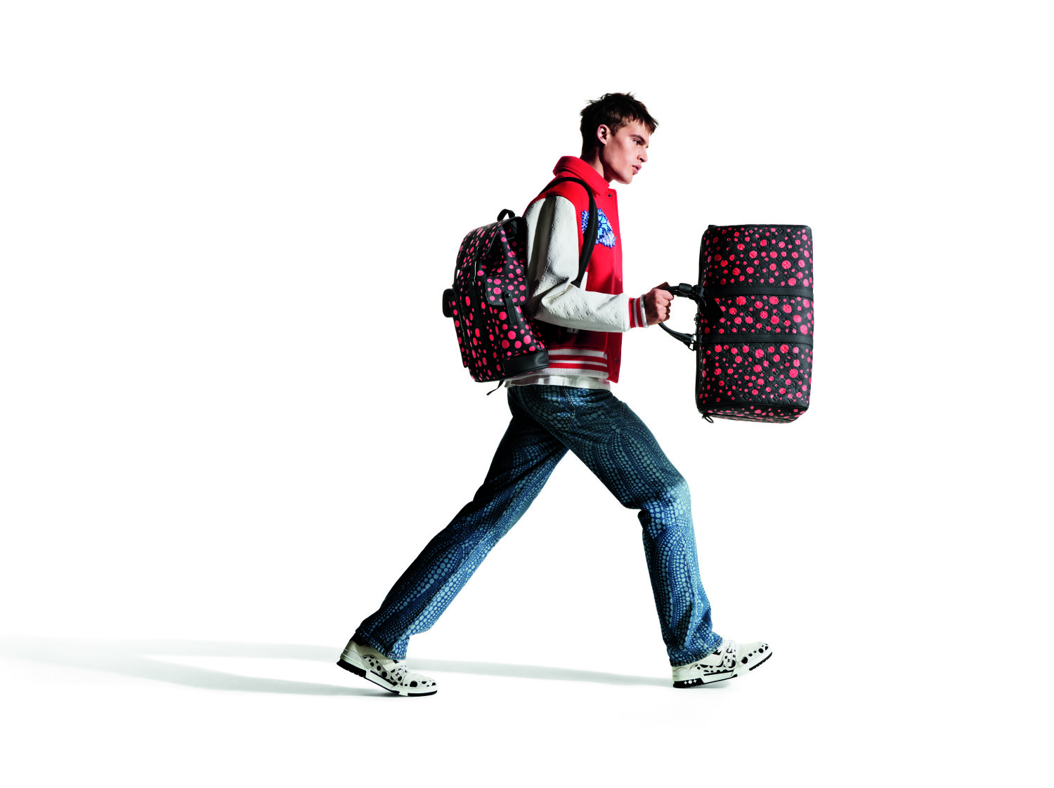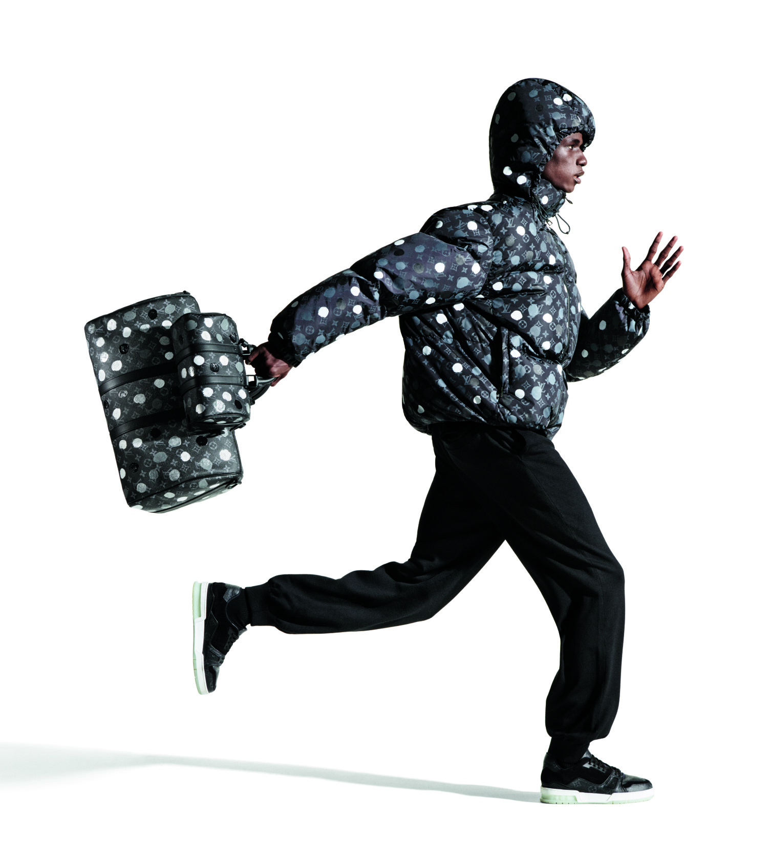 Một cuộc gặp gỡ đầy ngẫu hứng và vui nhộn giữa các dấu chấm nét cọ đặc trưng của Kusama với hoạ tiết Monogram của Louis Vuitton xuyên suốt bộ sưu tập này. Từ chiếc rương và vô số túi vải Monogram mềm biểu tượng của nhà mốt dành cho nam và nữ, đến bốt cao cổ, giày thể thao và giày derby… Các chấm sơn tiếp tục sinh sôi nảy nở thông qua các đồ da như túi Capucines màu trắng và túi Dauphine màu đen cũng như váy da màu đen với các nút nét cọ nhiều màu; sau đó là bộ đồ pyjama bằng vải chéo may sẵn, vải denim in phức tạp và hàng dệt kim cashmere dành cho phụ nữ với áo khoác ngoài được thiết kế riêng cho nam giới, với hình dạng của một chiếc áo khoác len nguyên chất được in chính xác.