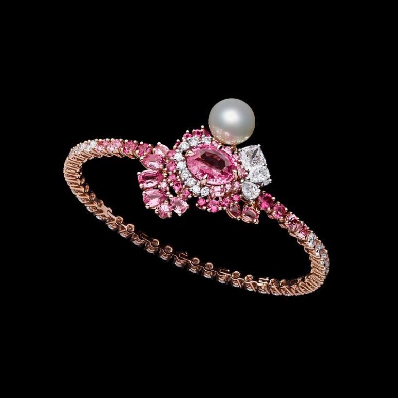 - Vòng đeo tay Tie & Dior với vàng hồng, bạch kim, kim cương, ngọc trai nuôi cấy màu trắng, ngọc bích hồng và hồng ngọc