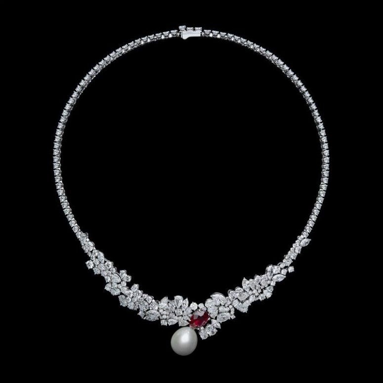 - Vòng cổ Tie & Dior bằng vàng trắng, kim cương, hồng ngọc và ngọc trai nuôi cấy trắng