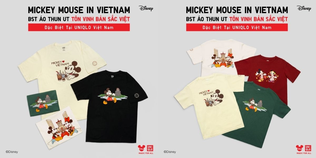 Nhân Tuần Lễ Cảm Ơn mùa Xuân/Hè 2025, BST UT Mickey Mouse in Vietnam tiếp tục mang đến ba họa tiết mới, khắc họa hành trình Mickey & Minnie thưởng thức cà phê sữa đá, khám phá chợ Bến Thành, hồ Hoàn Kiếm và mặc áo dài truyền thống.