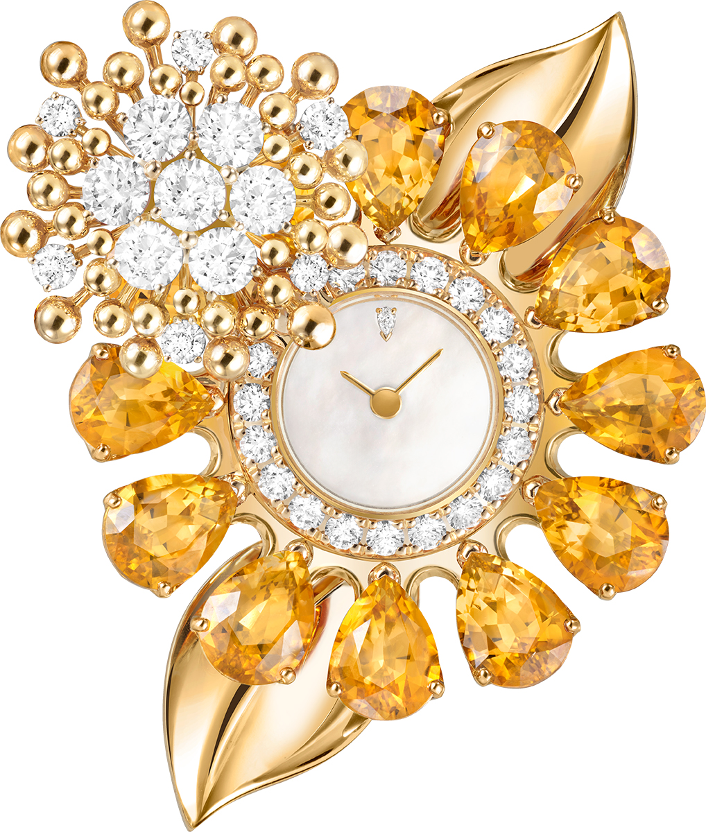 Tựa như những bông hoa vừa nở, các thiết kế trang sức và đồng hồ kết hợp những cánh hoa làm từ đá quý tinh xảo, nhụy bằng kim cương và lá bằng vàng để tạo nên những tác phẩm lấp lánh. Gợi lên hình ảnh thiên nhiên tươi tốt, ngập tràn ánh nắng, mỗi thiết kế đều thể hiện một đài hoa đang nở rộ.