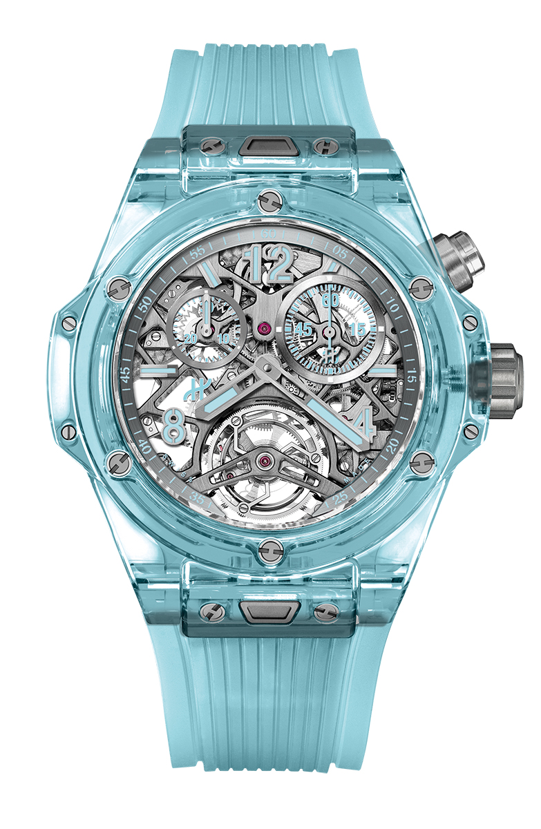 Cuối cùng, Big Bang Integrated Tourbillon Cathedral Minute Repeater trong chất liệu Blue Texalium làm nổi bật sự sử dụng rộng rãi của Hublot đối với các vật liệu hiệu suất cao như sợi carbon. Texalium có những đặc tính tương tự như sợi carbon dệt thông thường nhưng cho phép linh hoạt hơn trong độ chặt của cấu trúc dệt và khả năng chuyển màu. Với phiên bản độc bản này, một màu xanh lam sâu đã được chọn, lần đầu tiên được sử dụng cho vỏ, vành bezel cũng như dây đeo tích hợp. Bộ minute repeater mang đến một trải nghiệm âm thanh độc đáo, khác biệt hoàn toàn so với các vỏ kim loại truyền thống, với những tiếng chuông vang vọng, rõ ràng và sắc nét.