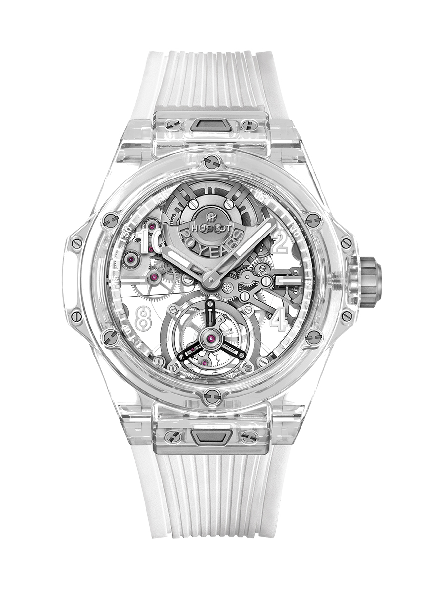 Chiếc đồng hồ đầu tiên trong bộ “Materials & High Complications” là Big Bang Tourbillon Automatic Sapphire, một kiệt tác cơ khí được bao bọc hoàn toàn trong bộ vỏ sapphire trong suốt. Điểm nhấn của thiết kế này chính là bộ máy tourbillon tự động với micro-rotor, được phô diễn đầy mê hoặc qua mặt số. Đặc biệt, rotor siêu nhỏ bằng vàng trắng 22K được chạm khắc tinh xảo với cấu trúc skeleton, mang dấu ấn “20 YEARS”, tạo nên một phiên bản kỷ niệm có một không hai.