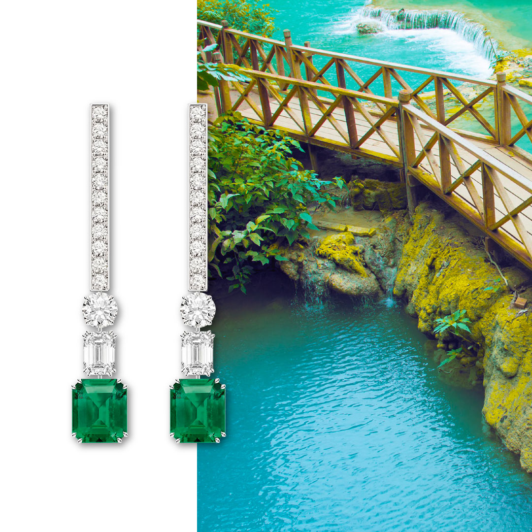 Sự tinh tế đầy tĩnh lặng của những viên đá sapphire và kim cương được tiếp tục phát huy trên đôi bông tai, với những viên đá có sắc độ gần như giống hệt nhau cả về tông màu lẫn độ bão hoà. Sự cân đối kỳ diệu này khiến ta không khỏi hoài nghi phải chăng chúng đã từng là cùng một viên đá trong lịch sử dài đằng đẵng của mình? Cặp đá này có độ tinh khiết đến mức khó lòng truy xuất các tạp chất – vốn là căn cứ để xác định nguồn gốc của viên đá; thay vào đó, chúng tự kể câu chuyện của mình, dịu dàng, quyến rũ, rủ rỉ bên tai của người sở hữu tạo tác này.