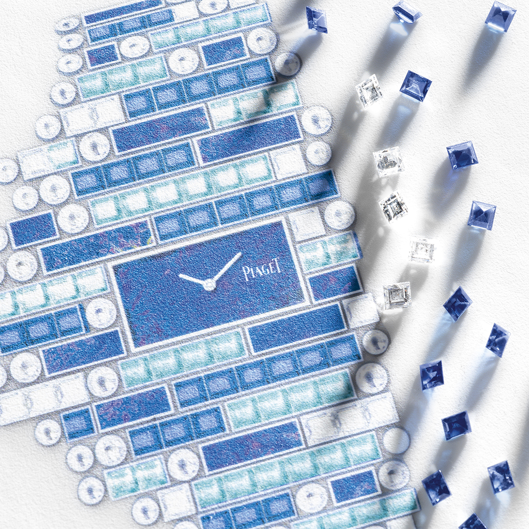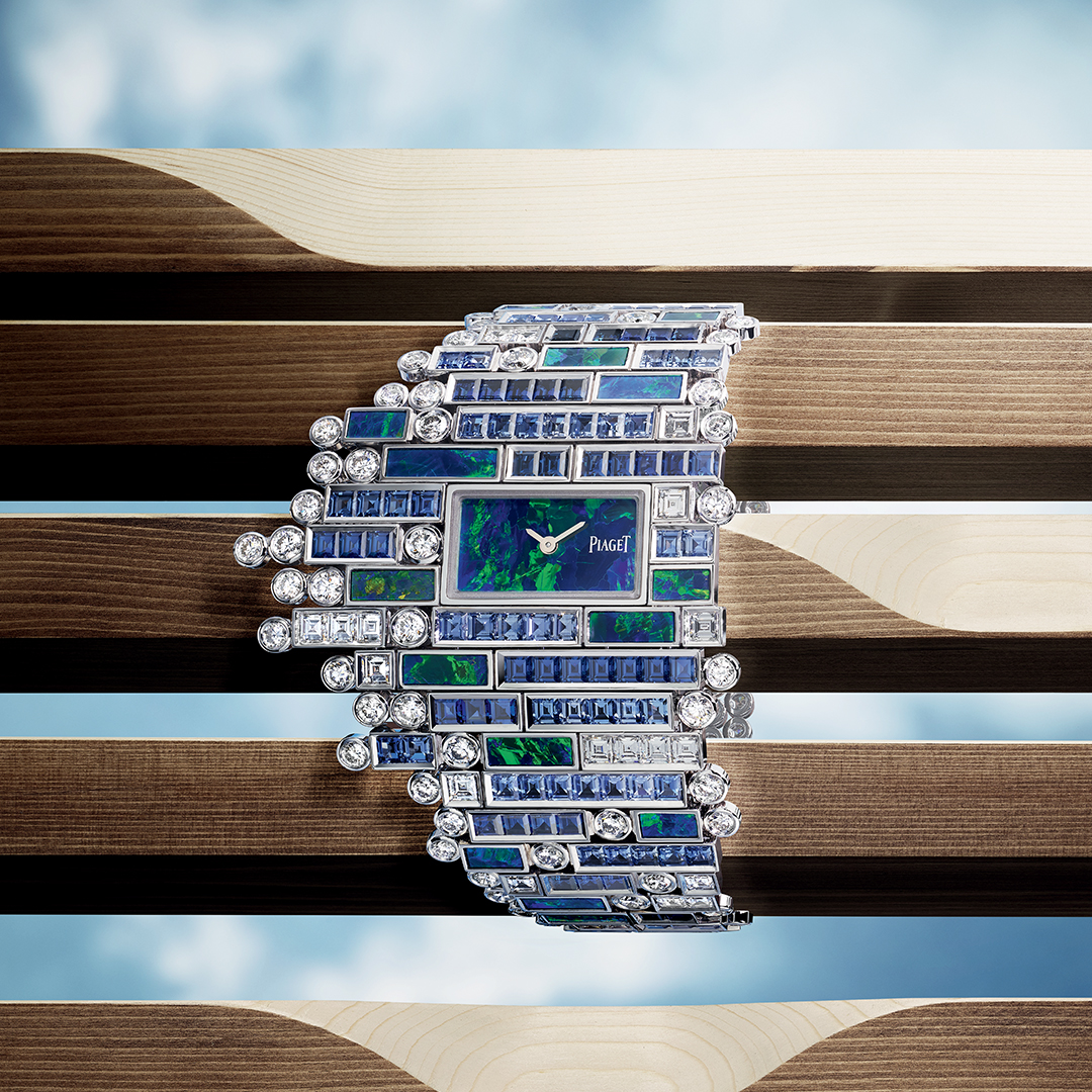Bộ trang sức mang tên Cenote được hoàn thiện với chiếc đồng hồ dạng vòng đeo tay, với sắc xanh dương và xanh lục của thảm thực vật nhiệt đới, của sắc thiên nhiên rực rỡ – hoà cùng sắc tối của ngọc mắt mèo đen (black opal) ở mặt số và các chi tiết trang trí. Nguồn đá mắt mèo đen tốt nhất thế giới đến từ nước Úc, được Piaget ưu tiên sử dụng trong hơn nửa thế kỷ qua, kể từ khi xuất hiện trong thiết kế đồng hồ từ những năm 1960. Sự bất đối xứng là đặc trưng của thẩm mỹ thời đó, nay được xử lý bởi bàn tay của bậc thầy kim hoàn để đem đến trật tự của sự bất tuần: tất cả các phần của cụm đá quý cắt nhiều dạng xung quanh mặt số được định vị trong một trật tự chính xác và tinh tế, phản ánh tinh thần thương hiệu của Piaget.