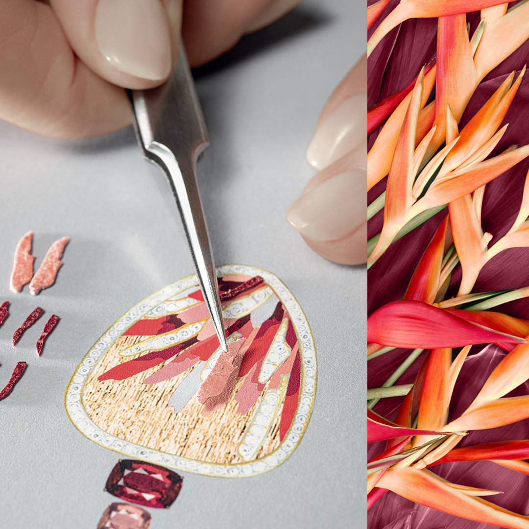 Đá rubellite và tourmaline hồng trên cặp bông tai như than hồng rực lửa, trong khi vàng hồng được lựa chọn để gửi gắm độ ấm của thời khắc hoàng hôn. Với tay nghề tinh tế, kỹ thuật khắc trên vàng lâu đời được lựa chọn để tạo ra bề mặt mềm mại trên nền kim loại lấp lánh. Trọng tâm ở đây là sự kết hợp giữ da, gỗ và xà cừ để khắc hoạ nên một bức hoạ độc đáo. Rose Saneuil đã phát triển một quy trình đặc biệt, cắt các mảnh gỗ nhỏ và da bê một cách chính xác nhất để ghép khớp vào các vị trí được định trước, tạo ra hiệu ứng của tia sáng mặt trời.