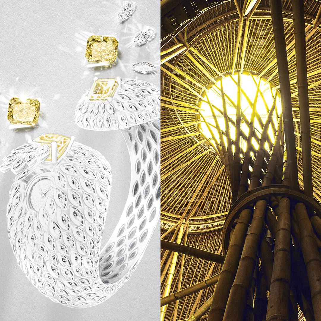 Phương pháp kết hợp mang tính đột phá này đã trở thành kỹ nghệ độc quyền mới của nhà chế tác lâu đời này. Xà cừ cũng được xử lý đặc biệt, cắt nhiều kích cỡ khác nhau và chế tác trên một mặt cong để đảm bảo sự thoải mái khi đeo. Một lớp phủ mỏng được phát triển đặc biệt cho phép sản phẩm này chống được nước và tia UV. Trong ánh hào quang sáng chói, đôi hoa tai của bộ Ecstatic Dance là đỉnh cao của sự kết hợp giữa những mảnh ghép khác nhau, đưa kỹ nghệ chế tác và thiết kế lên đến một tầm cao mới.