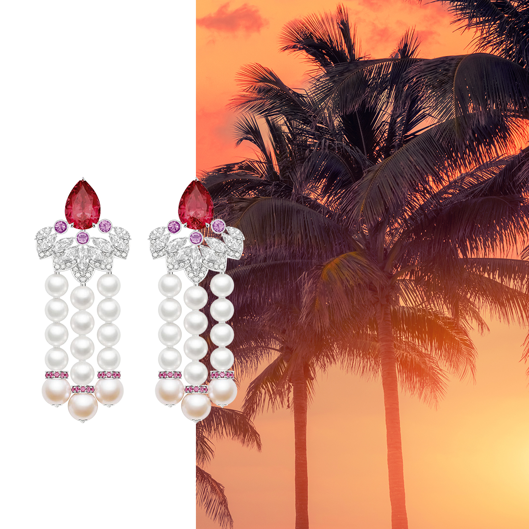 Bộ màu này cũng được cộng hưởng trong những chiếc khuyên tai của bộ trang sức này, lần này tập trung vào tôn vinh sắc đỏ rực rỡ của đá spinel. Ít thông dụng hơn ruby, nhưng không kém phần quý giá, loại đá này được gọi là “balas ruby” trong một thời gian dài, cho tới khi các chuyên gia đá quý phân biệt được sự khác nhau rõ rệt của hai loại đá này. Sắc màu mê hoặc của những viên đá quý nhiều màu tạo nên điểm nhấn cho tạo tác này, càng linh hoạt hơn với cấu trúc phức tạp đem lại sự thoải mái cho người đeo – chỉ riêng bộ hoa tai này đã cần hơn 140 giờ làm việc tại xưởng trang sức Piaget.