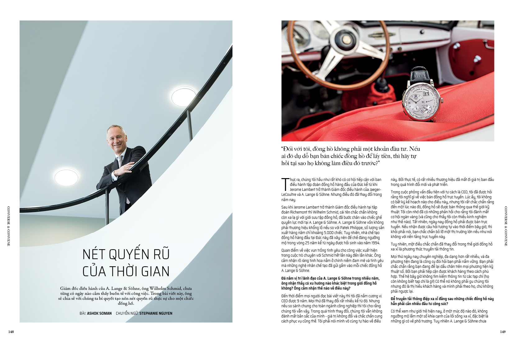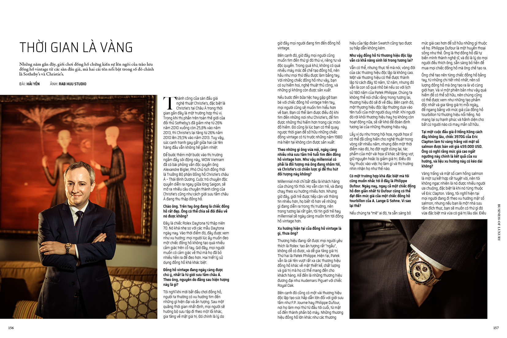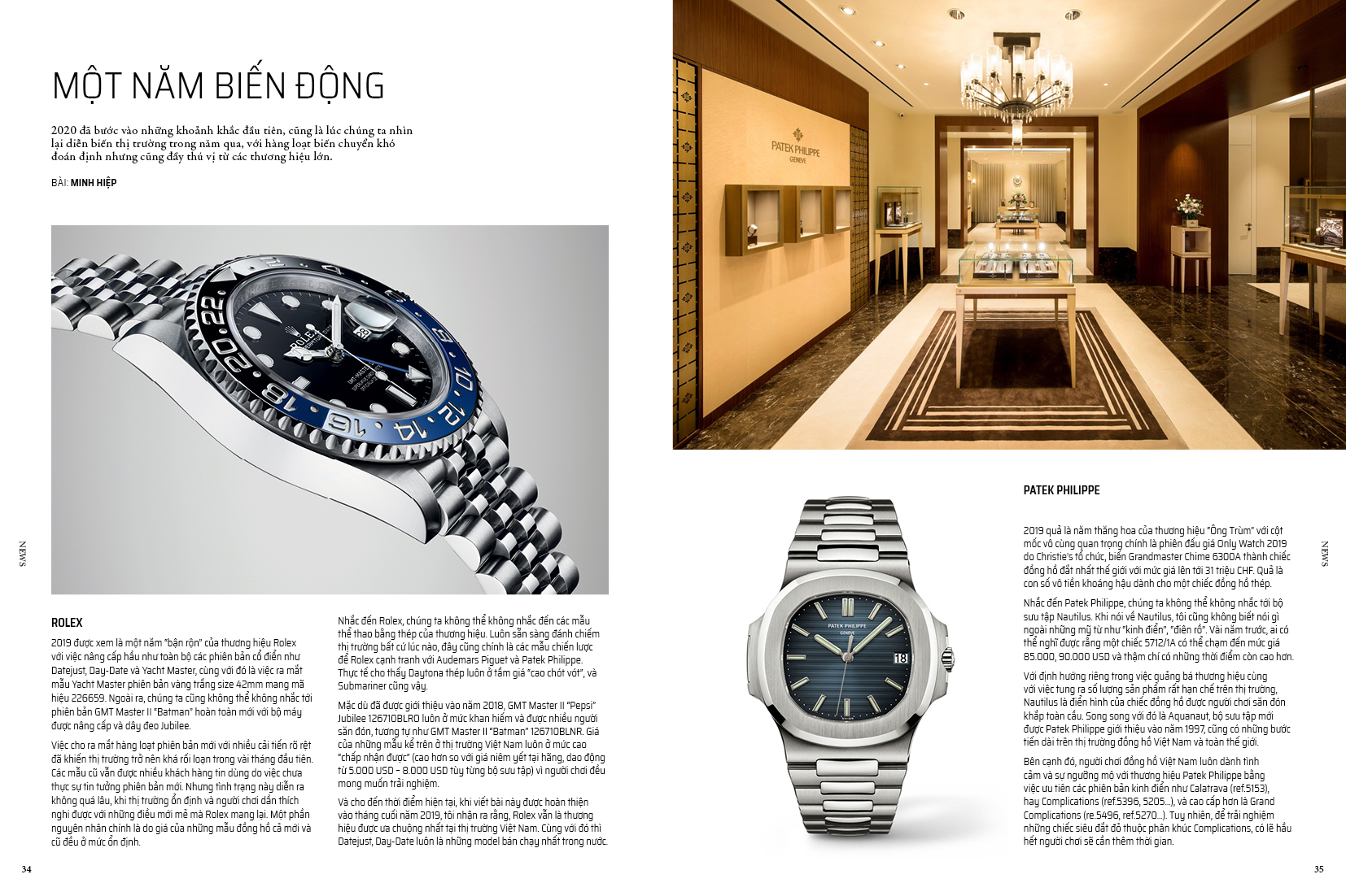 Bên cạnh đó, không thể bỏ qua những thông tin đáng giá kết lại hoạt động thị trường trong nước một năm qua, mà Rolex, Patek Philippe hay Hublot là những cái tên không thể thiếu (trang 30). Năm 2019 cũng đánh dấu sự xuất hiện của hàng loạt tên tuổi đại diện cho các trụ cột trong thế giới đồng hồ tại Việt Nam, được thể hiện qua các bài phỏng vấn độc quyền với A. Lange & Sohne (trang 148), Bell & Ross (trang 152) và Christie’s (trang 156).