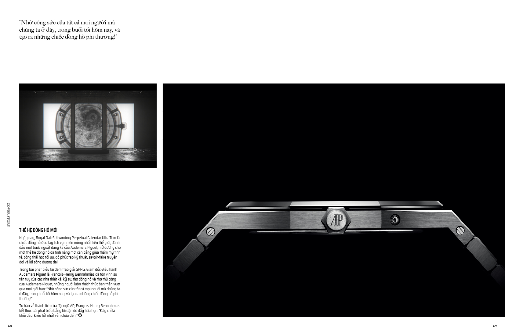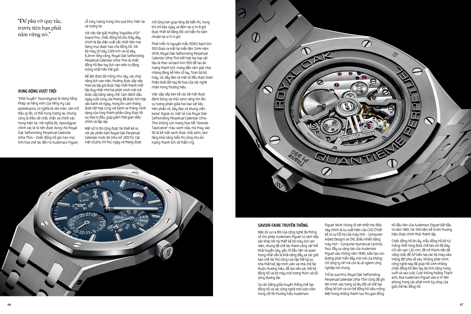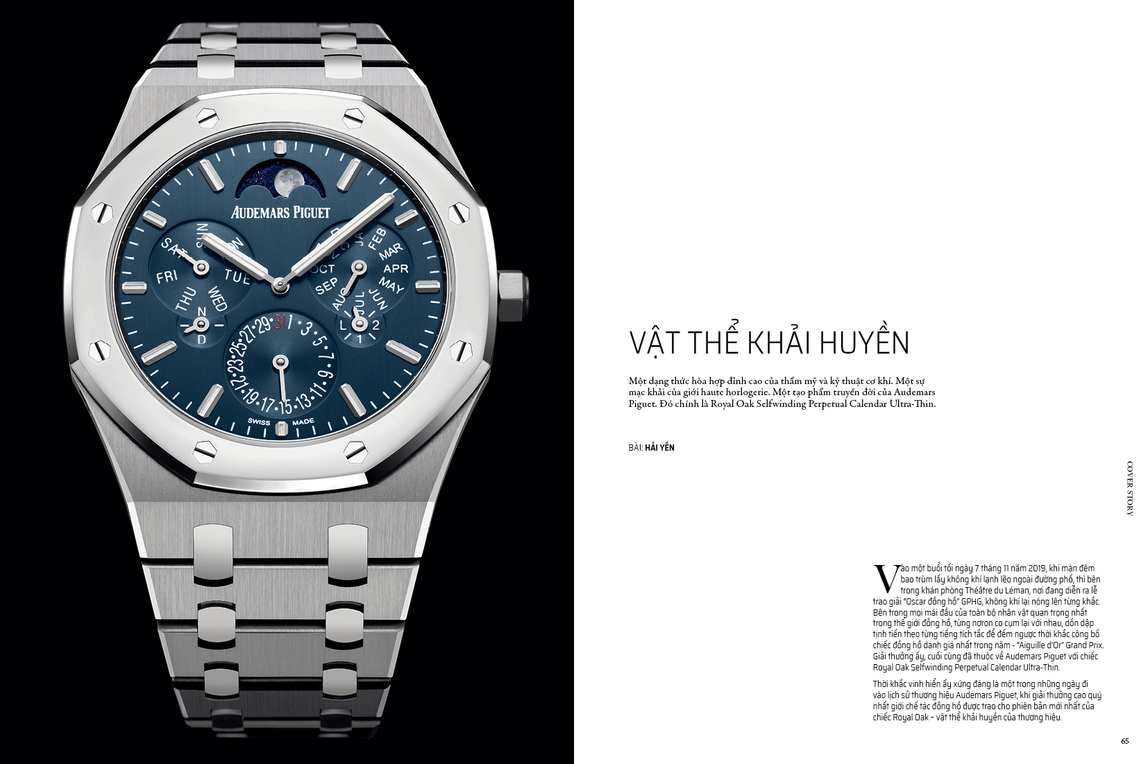 Kết thúc một năm, chúng tôi hân hạnh được mang đến tuyệt tác Royal Oak Selfwinding Perpetual Calendar Ultra-Thin – cỗ máy lịch vạn niên mỏng nhất trên thế giới, và cũng là chiếc đồng hồ vừa giành được giải thưởng Aiguille d’Or tại lễ trao giải GPHG. Câu chuyện về chiếc đồng hồ xuất sắc nhất trong năm cũng chính là câu chuyện trang bìa trong ấn phẩm lần này của chúng tôi (trang 60).