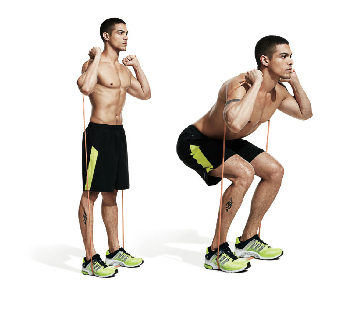 Đối với phần thân dưới, dây kháng lực mang lại lợi ích vượt trội nhờ khả năng kích hoạt nhóm cơ sâu và duy trì độ căng liên tục. Squat với dây kháng lực là bài tập nền tảng, giúp làm săn chắc cơ đùi và mông, đồng thời cải thiện sức mạnh toàn thân.