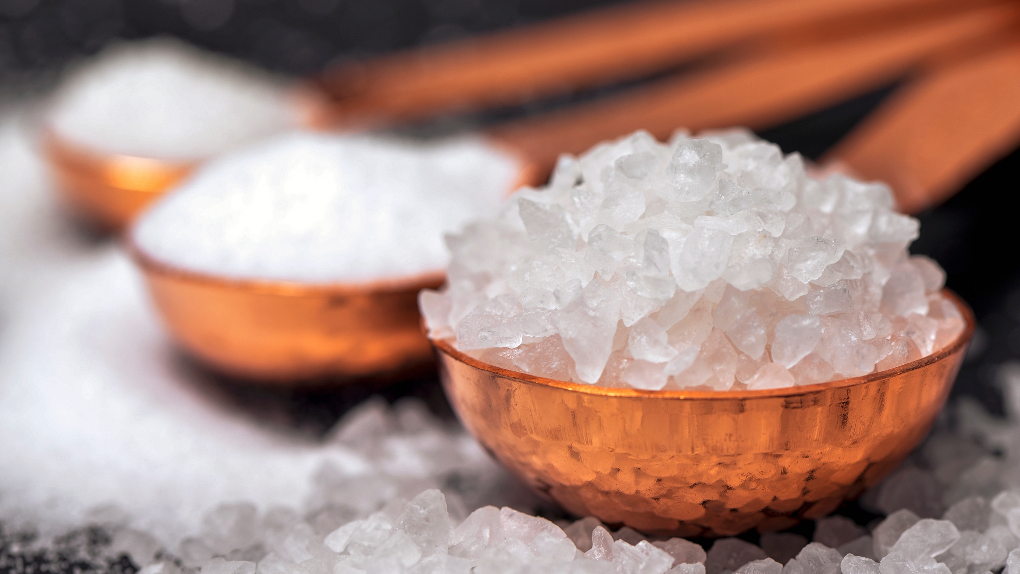 Three copper spoons with coarse salt close up.