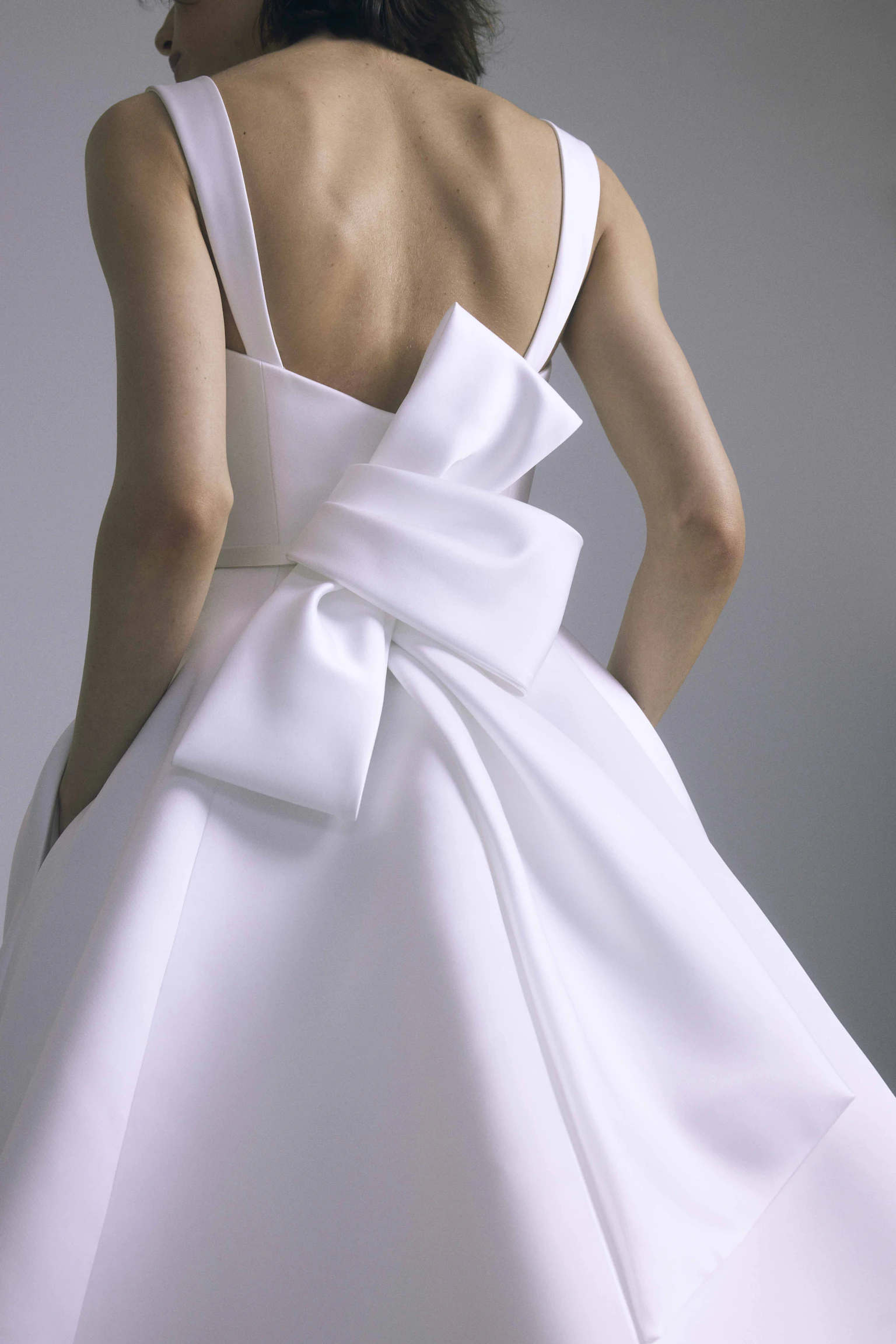 Nếu ta nghĩ rằng, một cô dâu lựa chọn phong cách thanh lịch và đơn giản thì sẽ chỉ nên mặc mẫu váy trơn là điều chưa chính xác. Đôi khi, nhờ một điểm nhấn thị giác như chiếc nơ lớn, kết hợp với tà váy cũng đủ tạo nên nét nữ tính vượt thời gian trong thế giới thời trang cô dâu.
