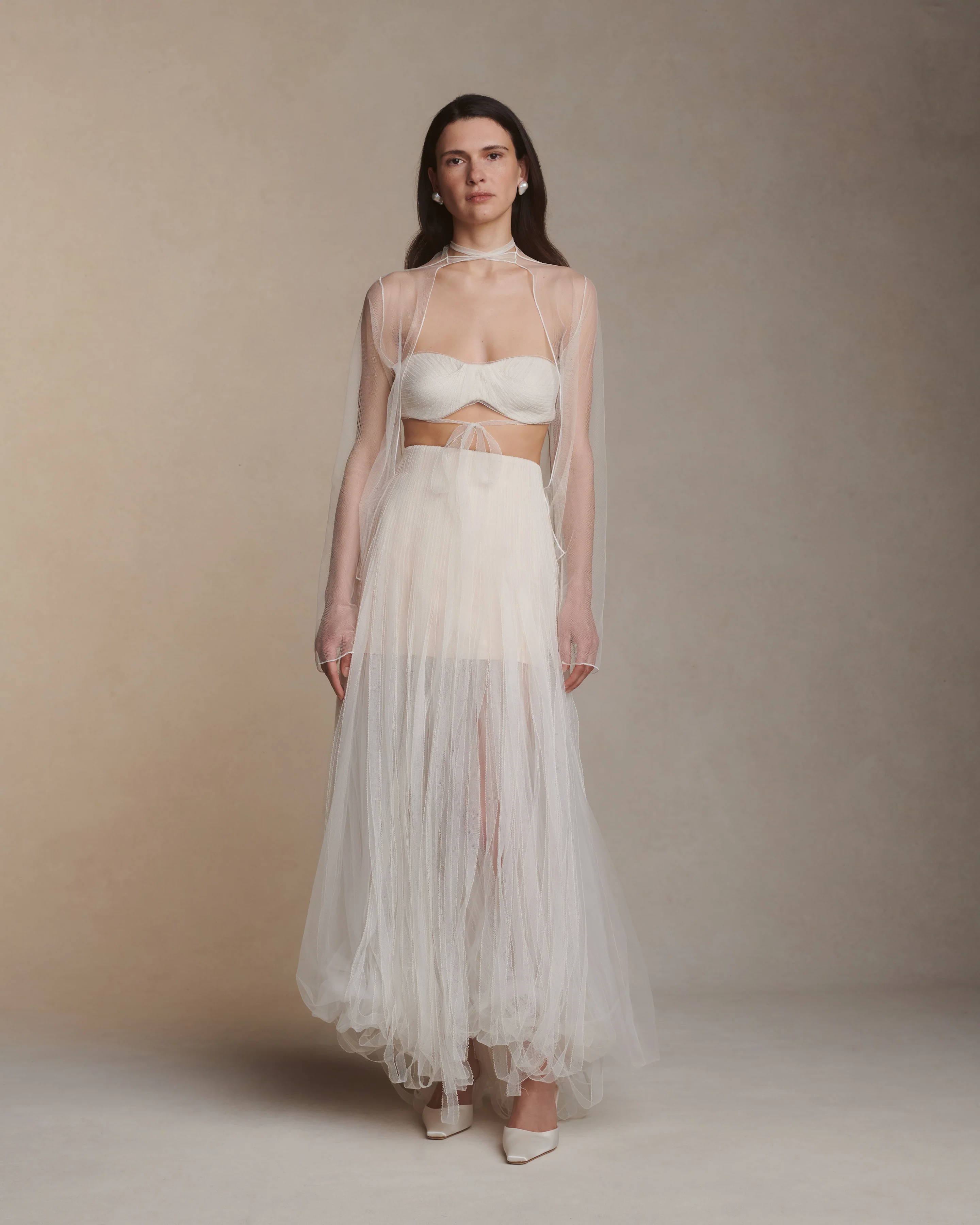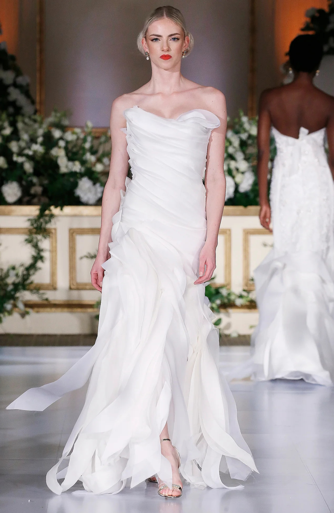 Đây có thể là những bộ váy cưới có hình thức tổng thể không lấp lánh, nhưng chắc chắn gây ấn tượng đặc biệt nhờ các nếp gấp phức tạp, mang lại tinh thần hiện đại cho kỹ thuật truyền thống. Một cô gái yêu thích vẻ đẹp tối giản của nghệ thuật hình khối chắc chắn sẽ không bỏ qua mẫu váy cưới này.