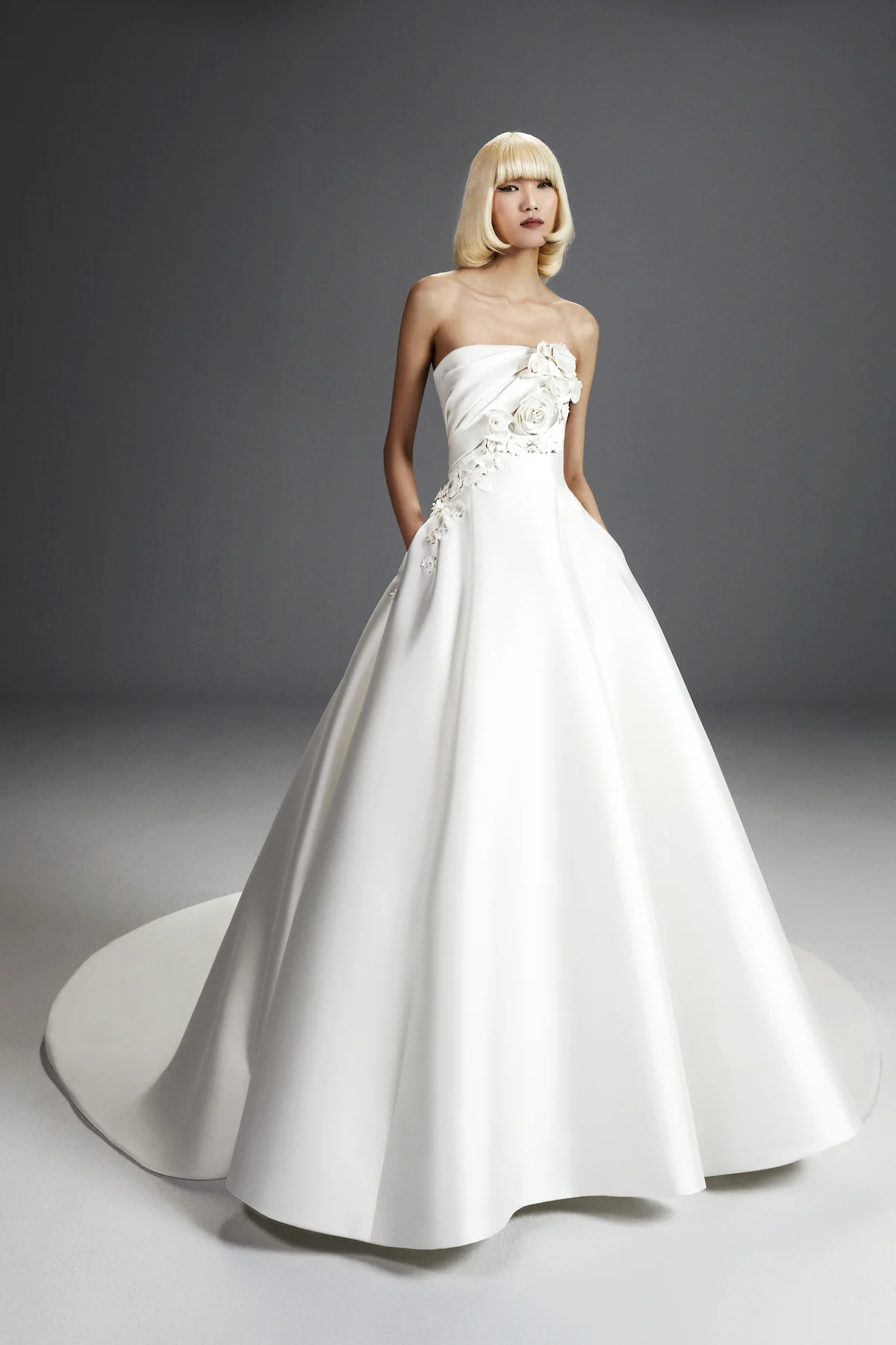 Mặc dù phom dáng váy dạ hội luôn là kinh điển trong dòng thời trang cô dâu, nhưng ở mỗi mùa, các nhà mốt sẽ cho ra đời các phiên bản sáng tạo nhằm hướng đến những vị khách yêu thích tính độc đáo. Năm nay, các nhà thiết kế hàng đầu thế giới như Elie Saab, Theia và Amsale đã khéo léo ứng dụng nghệ thuật gấp giấy origami, nhằm mang đến vẻ sang trọng và quý phái từ những đường cắt may bậc thầy, tạo cấu trúc váy cầu kỳ và tinh xảo.