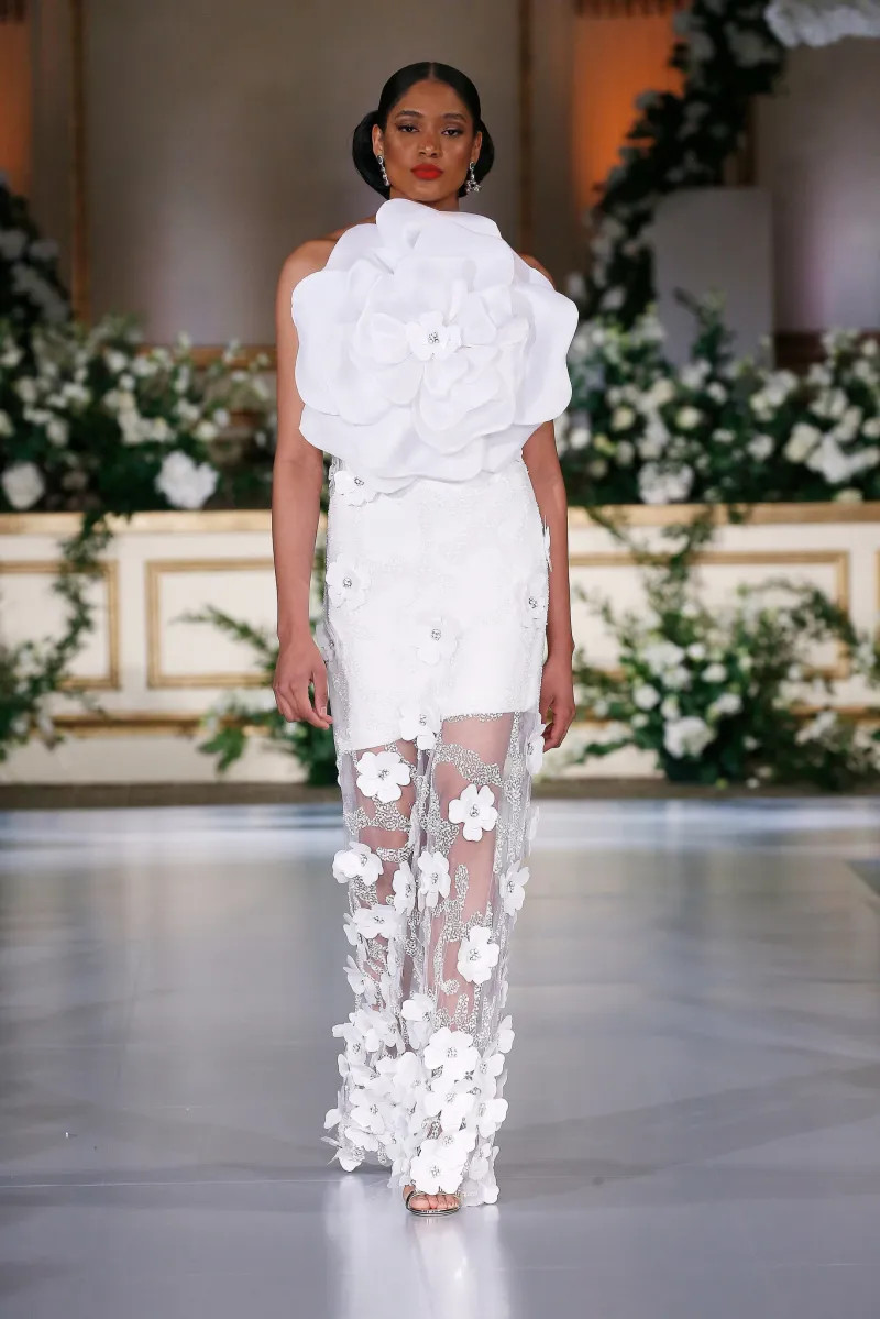 Giới mộ điệu có thể dễ dàng cảm nhận điều đó qua thiết kế của nhà mốt Esé Azénabor và Gattinolli by Marwan. Hơn thế nữa, các thiết kế váy cưới năm nay xuất hiện “luồng gió mới” trong cách dùng hoa để trang trí. Khi xuất hiện trên sàn diễn của Nardos, Madeline và Badgley Mischka, các mẫu hoa 3D bằng vải đã thu hút sự chú ý đặc biệt của giới mộ điệu.