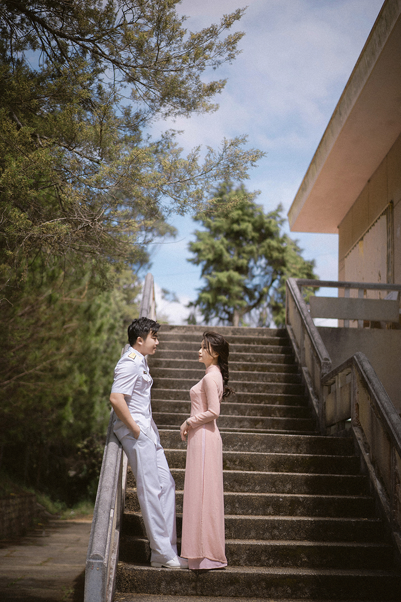Chàng là lính hải quân công tác miền biển. Cô gái là nhân viên phục vụ bộ phận mặt đất cho các chuyến bay. Lấy cảm hứng từ câu chuyện tình của cặp đôi, ba trang phục khác nhau hiện diện trong bộ ảnh cưới điểm lại những cột mốc đáng nhớ trên hành trình yêu: Mỗi người theo đuổi một giấc mộng riêng rồi định mệnh dẫn lối nên duyên vợ chồng.