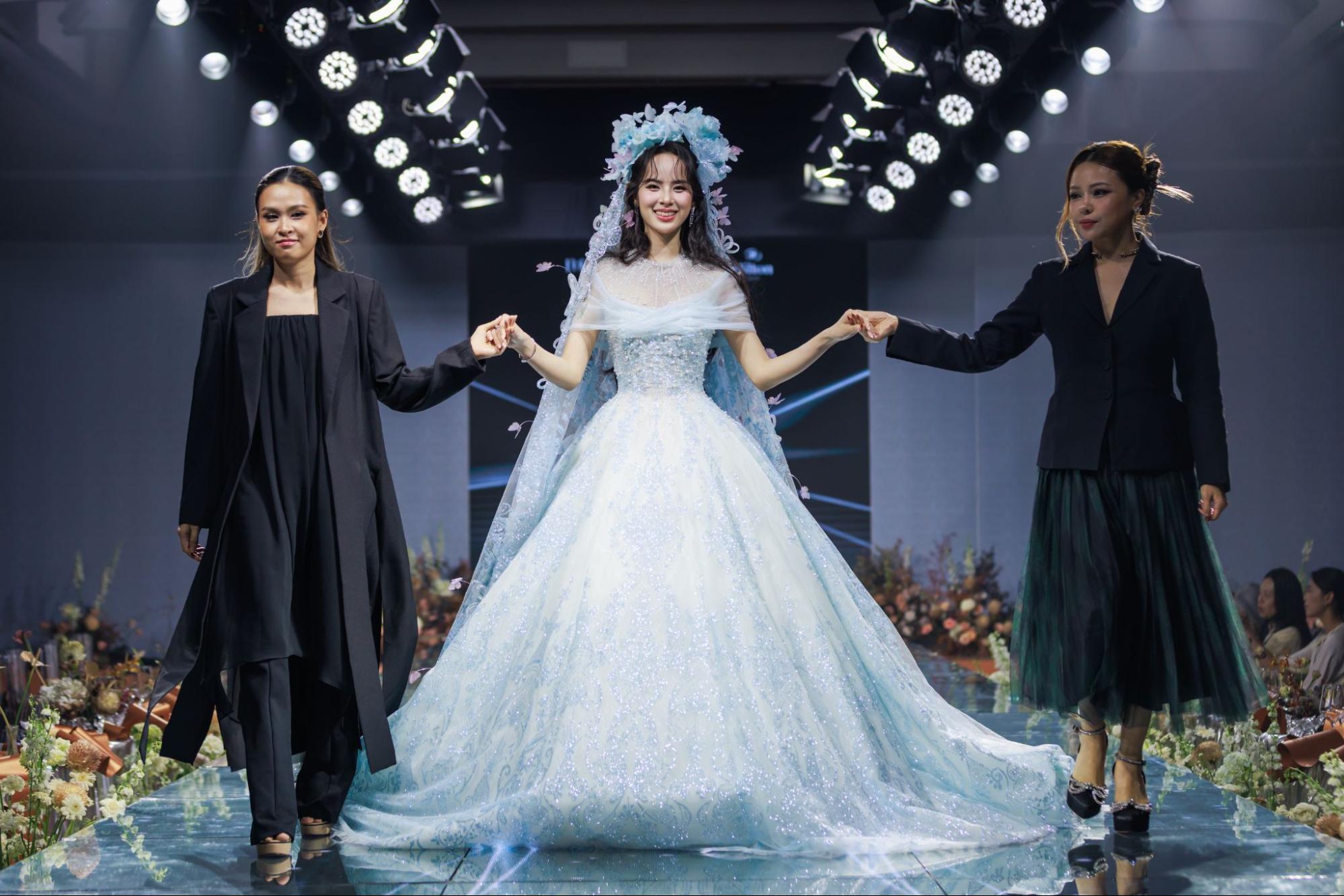 Bên cạnh đó, ca khúc “Cảm ơn em” sâu lắng của Hồ Trung Dũng, những giai điệu ấm áp và trữ tình đã phủ lên không gian một lớp cảm xúc dịu dàng, như lời chúc phúc cho những tình yêu bền lâu. Dưới sự chỉ đạo của chị Nhã Trúc – Catwalk Director, từng bước chân của người mẫu như thổi hồn vào những câu chuyện cưới, đưa khán giả đi từ sự choáng ngợp đến say đắm.