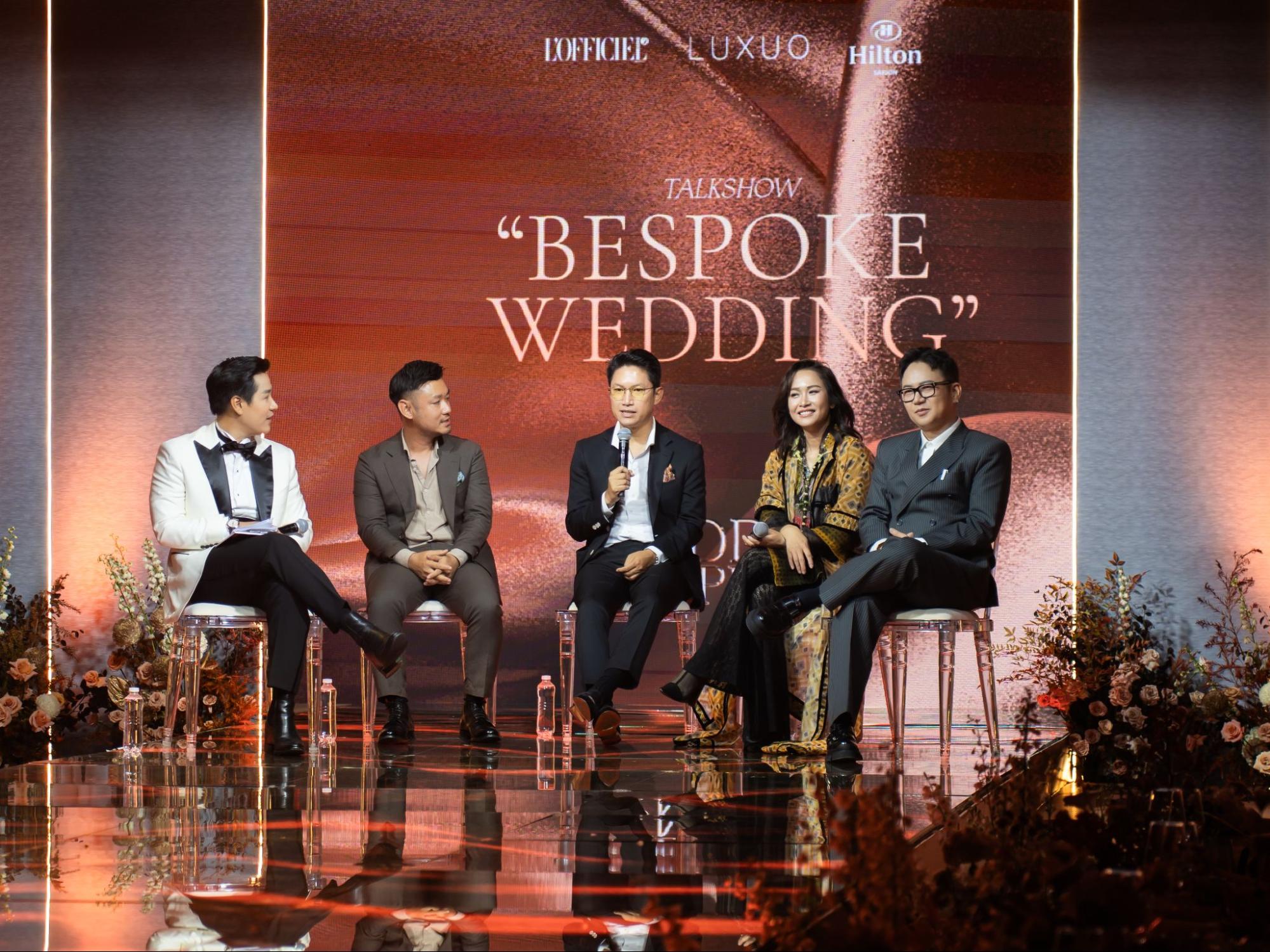 Talkshow chủ đề “Bespoke Wedding – Vẻ đẹp vượt thời gian và độc bản” mở màn bằng cuộc đối thoại sâu sắc giữa các diễn giả: chị Lê Thùy Thảo Nguyên – Creative & Show Director, anh Nicolas Minh Nguyễn – CEO Cao Minh Saigon, NTK Chung Thanh Phong và Director & Photographer Louis Wu. Mỗi chia sẻ đều mang đến góc nhìn đa chiều về nghệ thuật tổ chức lễ cưới, từ giá trị của cá nhân hóa đến tính trường tồn trong ngành cưới. Qua đó, khắc họa câu chuyện tình yêu thành những khoảnh khắc đầy xúc cảm và mang đậm dấu ấn riêng cho ngày trọng đại.